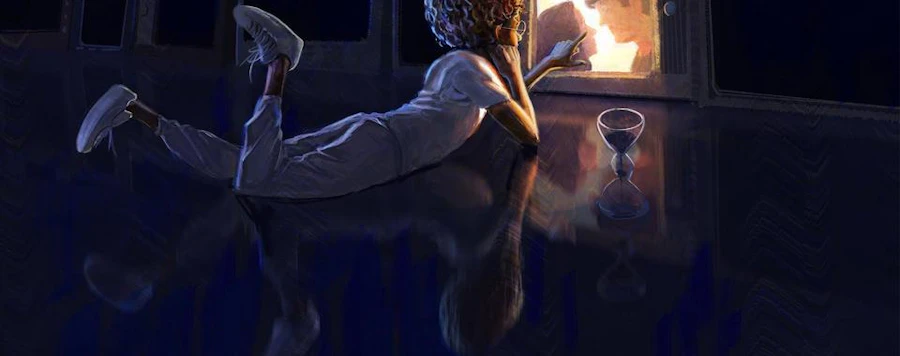 A little girl watches omnisciently as a man’s life unfolds on monitor screens, and occasionally reaches out to make small adjustments.